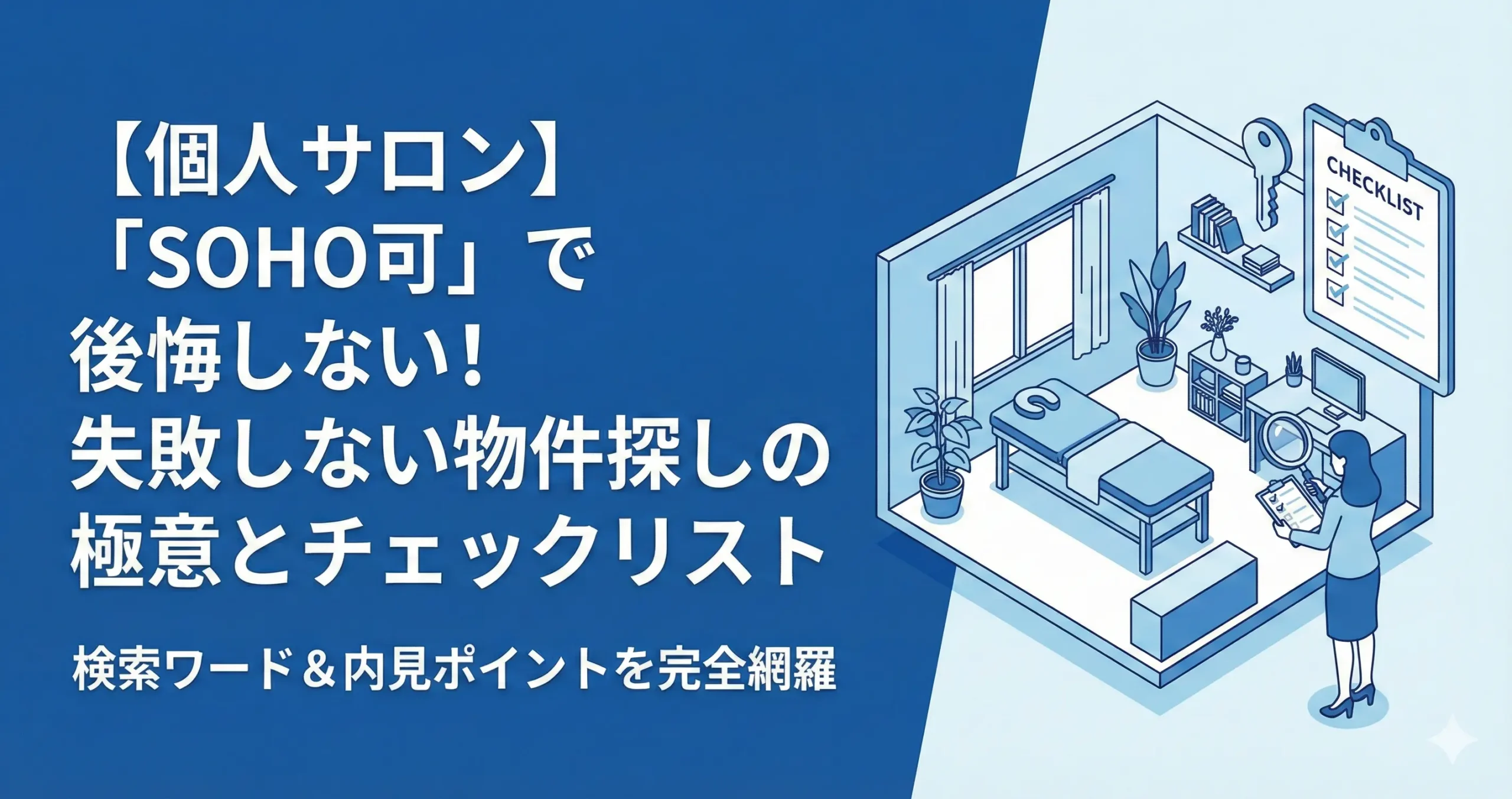 個人サロンの開業で一番の難関は「物件探し」です。「SOHO可」と「事務所可」の違いは?SUUMOでの探し方は?隠れ家サロンを成功させるために、物件検索のコツから、内見で必ず確認すべき水回り・電源・セキュリティのポイントまでを徹底解説します。