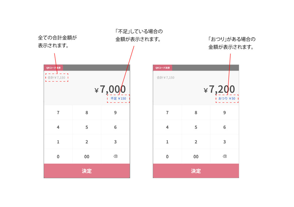 電卓に金額を入力し、不足している場合は金額の下に青文字で「不足」と表示され、足りない分の金額が表示されます。また、お釣りがある場合は表示が、「おつり」に変更され、おつりの金額が表示されます。