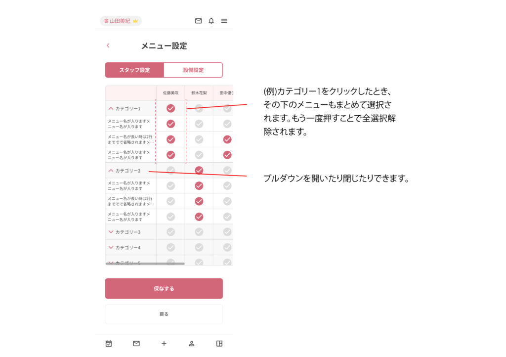 スタッフ設定と操作は変わりません。各メニューに必要な設備を設定できます。